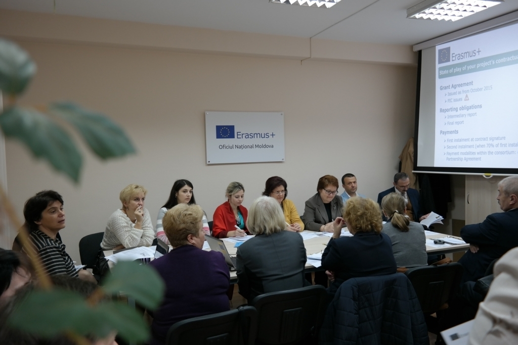 Reprezentanții universităților din Republica Moldova, implicate în proiectele de Consolidare a Capacităților, selecția 2015, au participat vineri, 16 octombrie, la Oficiul Național Erasmus+, la o ședință de informare cu France Dantin, manager de proiecte la Agenția Executivă pentru Educație, Audiovizul și Cultură (EACEA), cu sediul la Bruxelles. Întâlnirea a avut loc la sediul NEO din Chișinău.